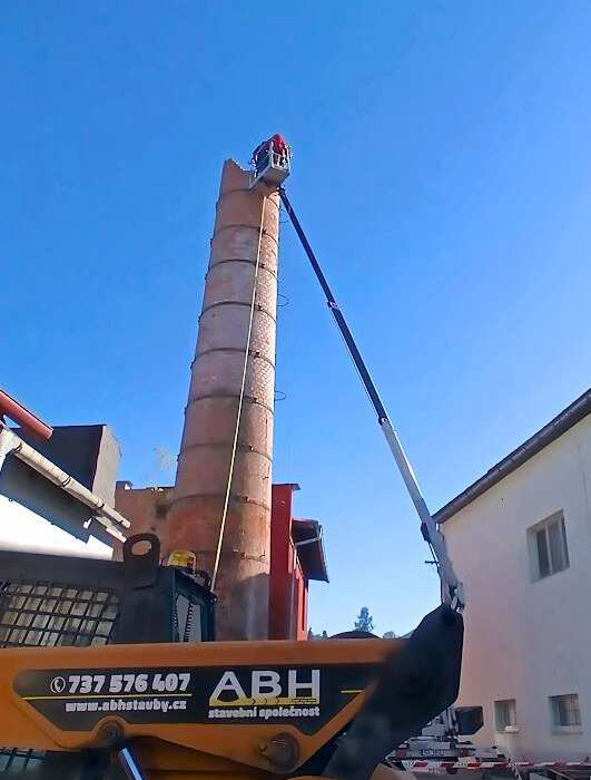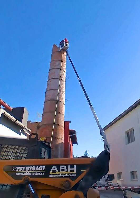 Demolice komínu probíhala ve dvou fázích. Nejprve jsme komín ručně odbourali z vysokozdvižné plošiny. Jakmile jsme se dostali do výšky, kde bylo možné bezpečně použít bagr („pavouka“) pokračovali jsme v demolici až do úrovně terénu. Práce zahrnovala i odvoz suti a celkový úklid lokality.