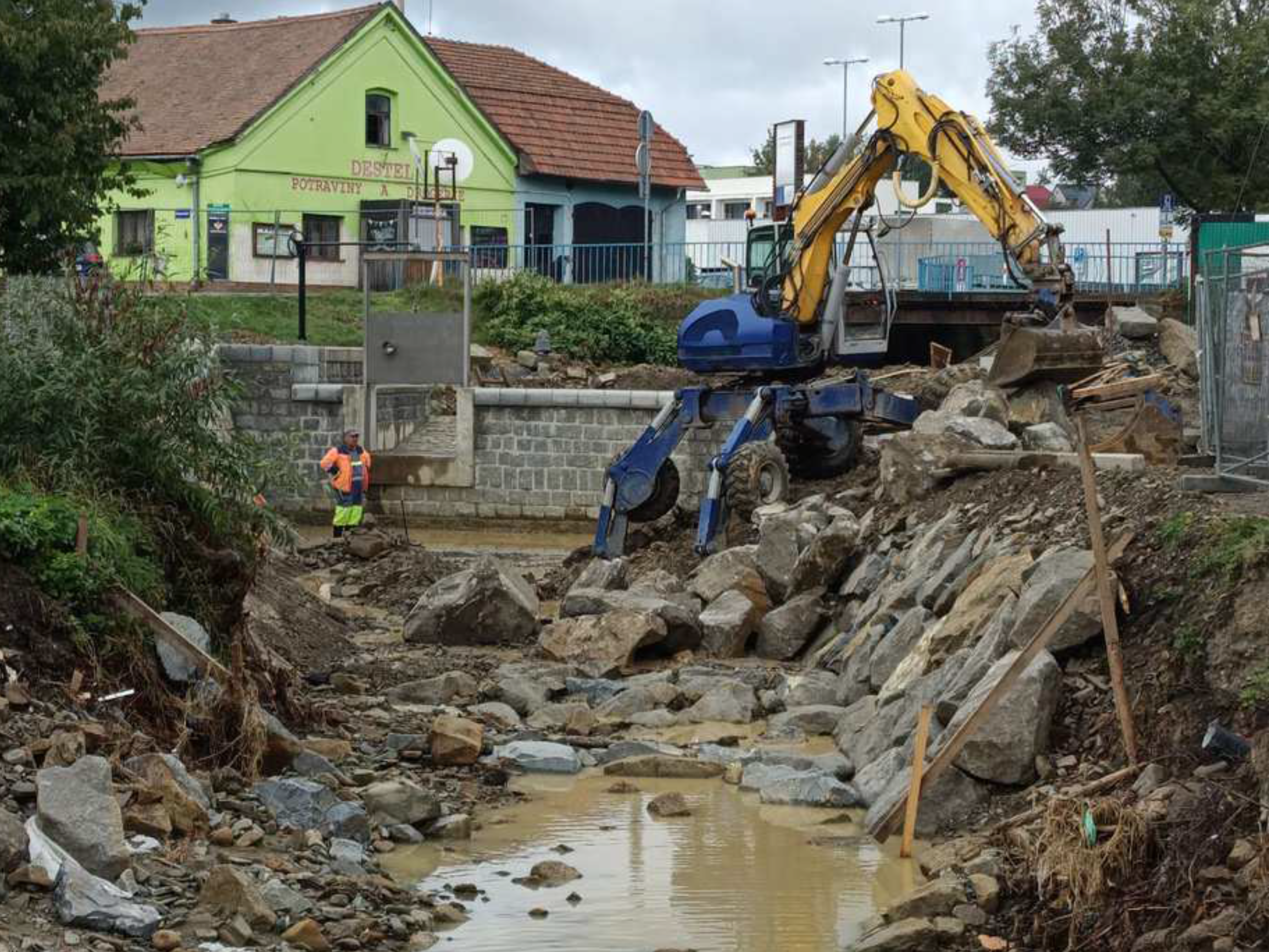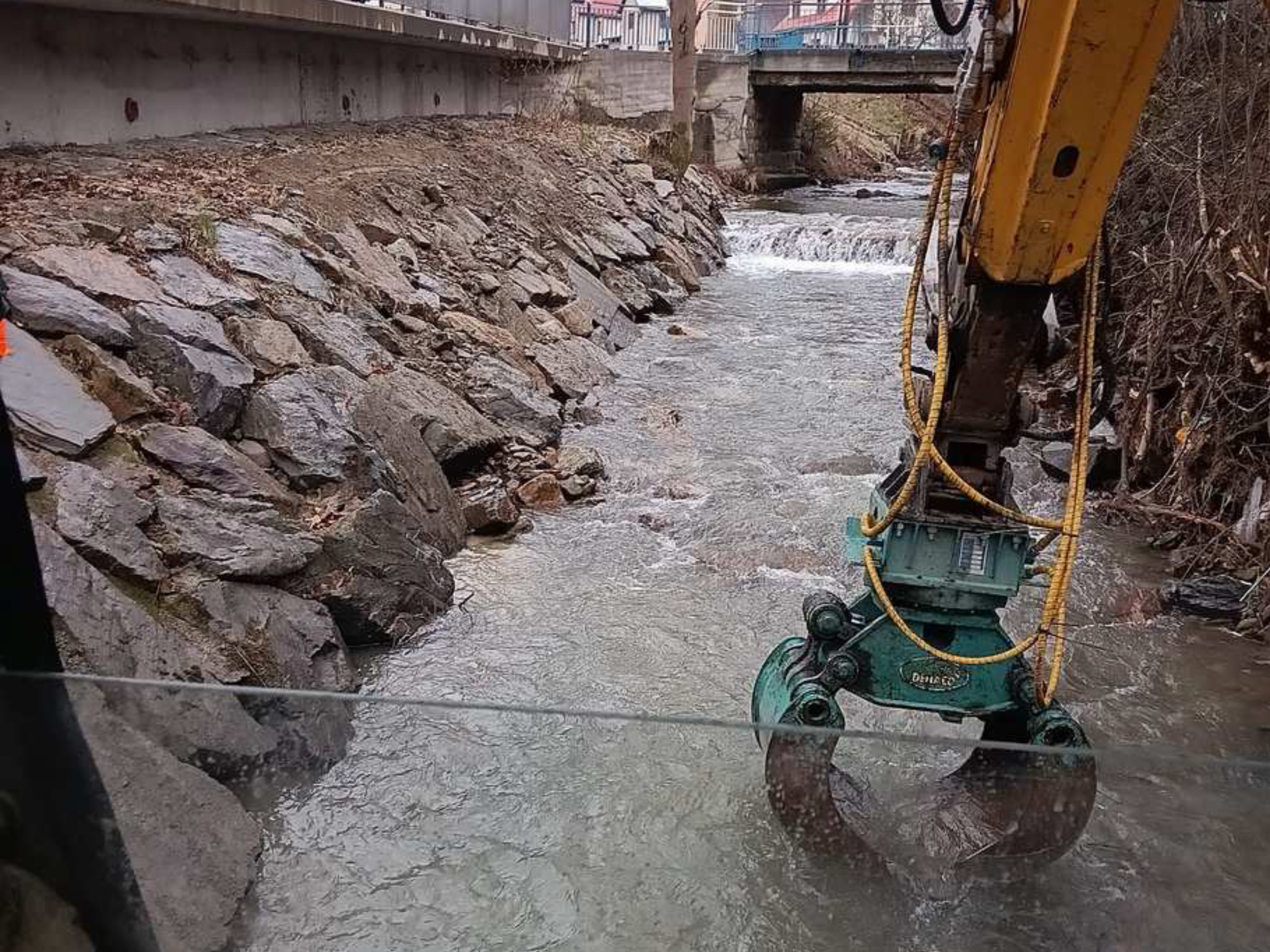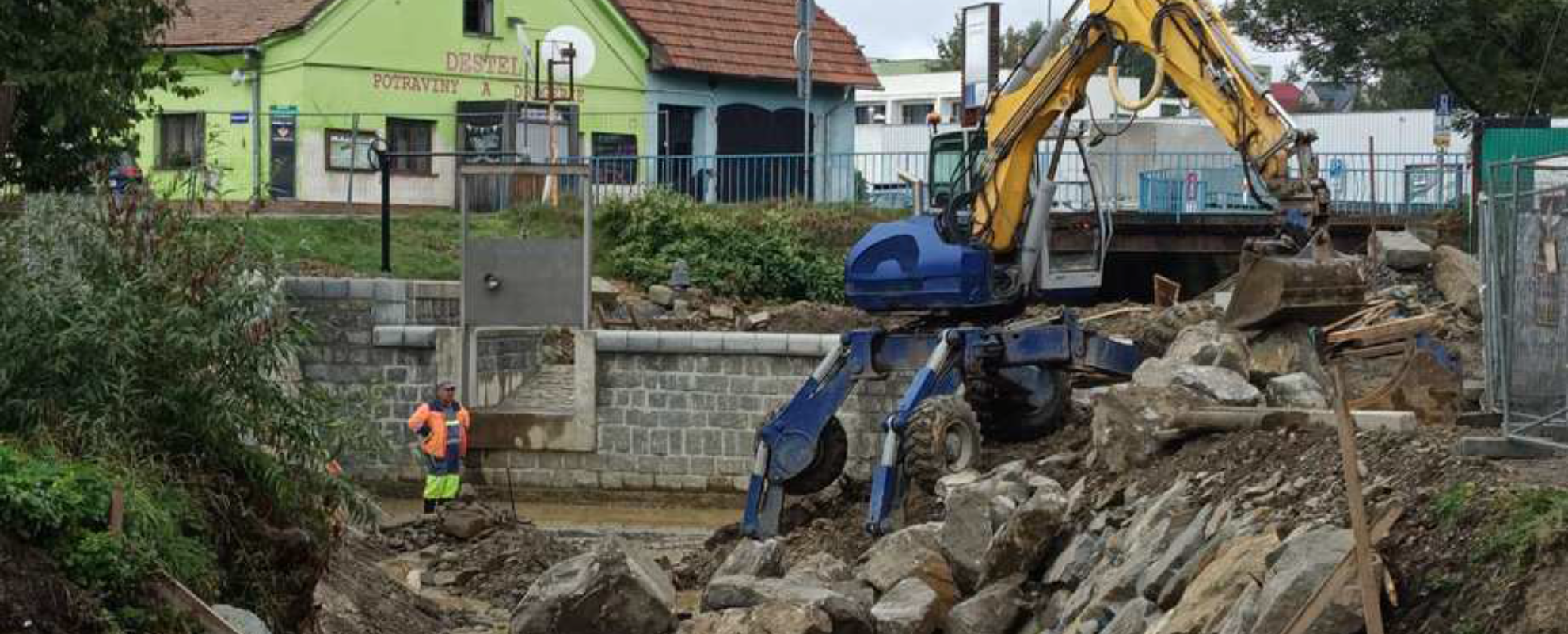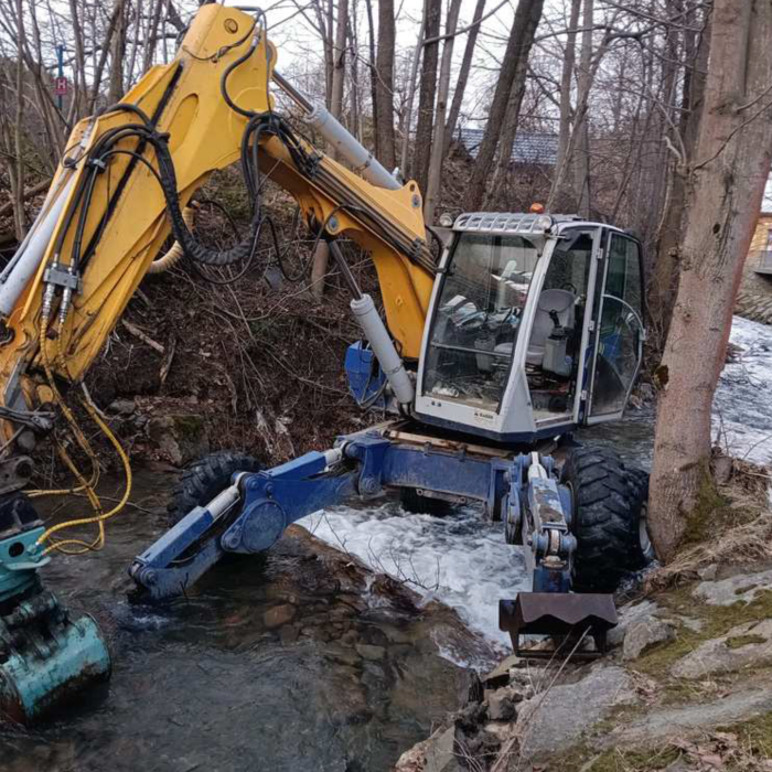 Cílem projektu byla stabilizace a zpevnění koryta potoka a jeho břehů. Použili jsme technologii ukládání velkých kamenných bloků pomocí našeho „pavouka“. Kameny byly precizně osazeny a uspořádány tak, aby efektivně odolávaly síle proudící vody. Vzniklo trvalé a funkční řešení, které chrání břeh před erozí a minimalizuje riziko budoucích povodní.