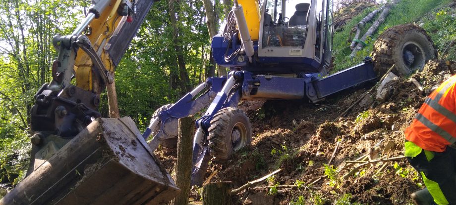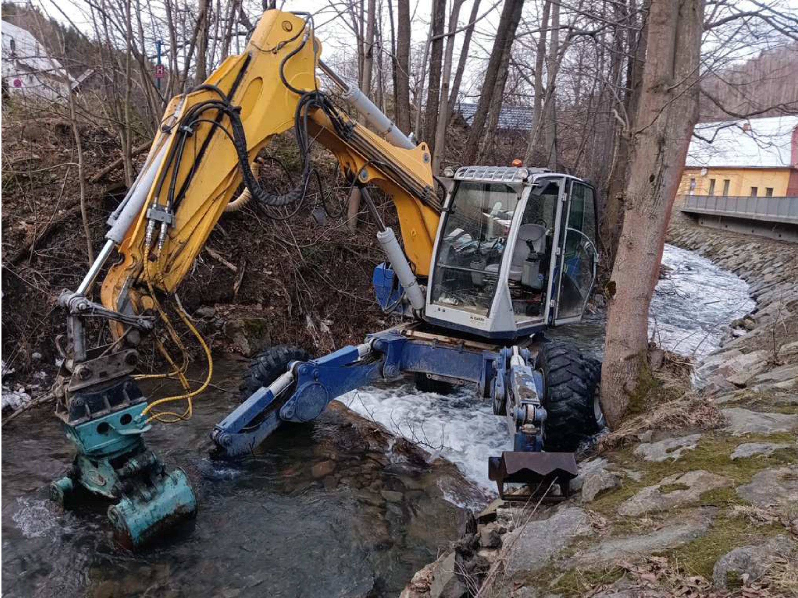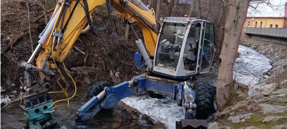 Naše technika se pohybuje i přímo v korytě řeky, což nám umožňuje provádět čištění, odbahňování a protipovodňová opatření bez narušení okolního terénu.